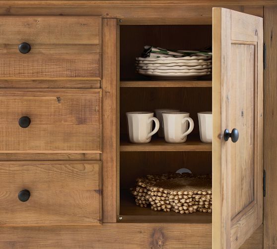 - Buffet is fitted with 2 cabinets, each with paneled doors, 2 adjustable shelves and 3 drawers.