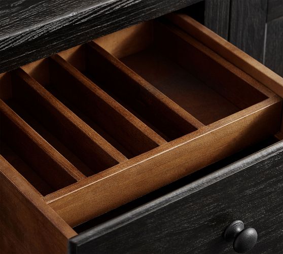 - English dovetailed drawers open smoothly on waxed wood glides, and feature drawer stops for safety.