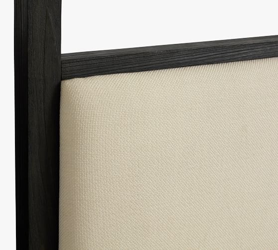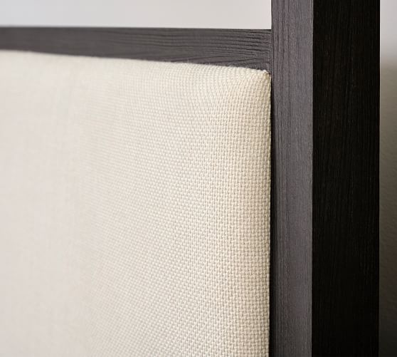 - The back of the headboard is upholstered in black muslin fabric.