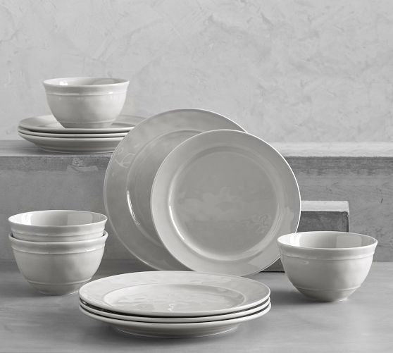 - 12-piece set includes 4 dinner plates, 4 salad plates, and 4 cereal or soup bowls.