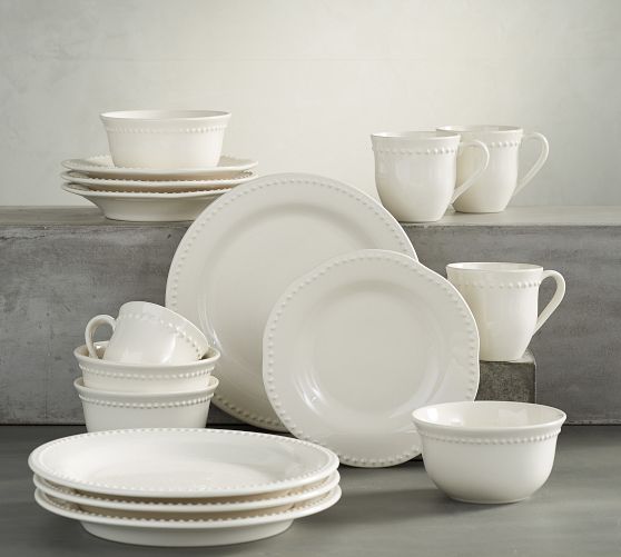 - White beaded dinnerware comes in complete sets and piece sets, with matching platters and accessories to round out your table.