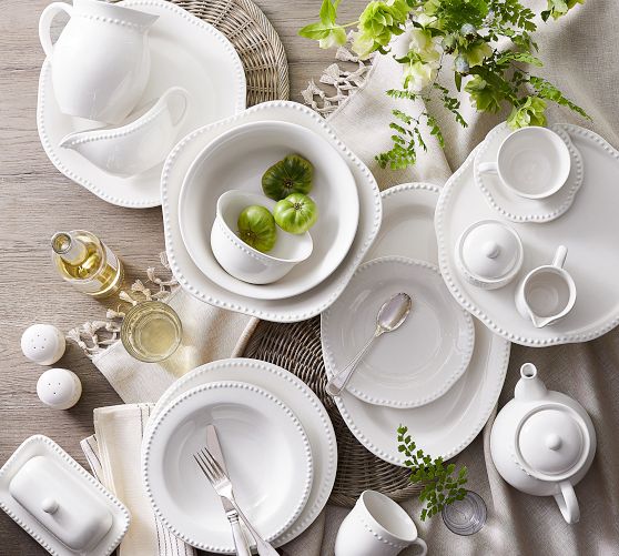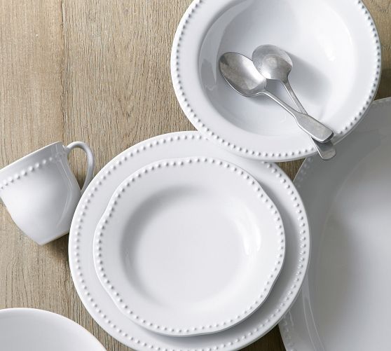- White beaded dinnerware comes in complete sets and piece sets, with matching platters and accessories to round out your table.
